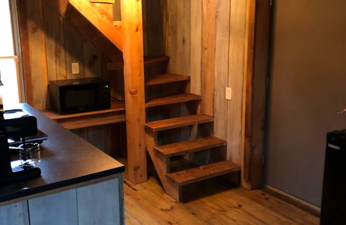 The Carol Jean is a historic cabin getaway that we renovated a few years ago. The Carol Jean includes a kitchenette with granite countertops and all new appliances. The bath includes a large natural rock shower. The cabin sleeps four, with a king bed on the first level and two twin beds on the second level (loft). There is an all redwood deck with a swing for outdoor relaxation.