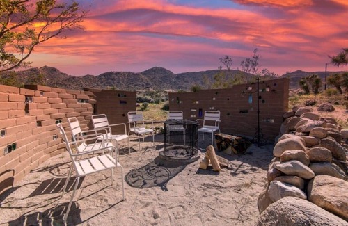 Experience the magic of the high desert at The Desert Lily. Surrounded by a stunning adobe and bottle wall, this tranquil oasis offers the perfect blend of relaxation and adventure. Whether you're gazing at the brilliant starry sky or bathing in the intense desert moonlight, every moment is a delight. Cozy up around the fire pit on cool evenings or curl up in a hammock and dream of other worlds. The weather in the high desert is cooler than Palm Springs, just 40 miles away, making it the perfect destination for fall and winter activities and springtime desert blooms.