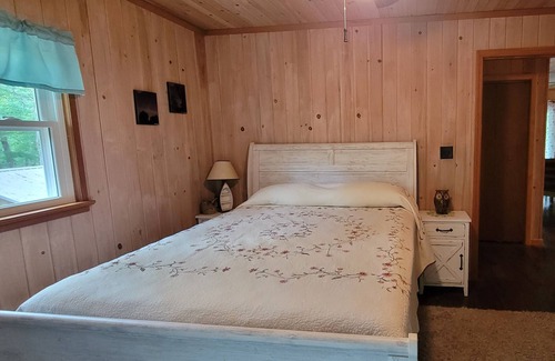 Two level cabin with a master queen bedroom and bath on the bottom level where you can rest in complete darkness if you so desire and the other bedrooms and bath on the main floor with the kitchen and living room. The queen bed on the main floor has private rear porch access through sliding doors.
