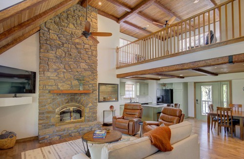 Retreat to this spacious 7-acre cabin getaway and gaze at deer, foxes, and birds, while you unwind in peace. Nestled on a wooded hillside just miles off of Route 66, Red Fox Ridge is perfect for any nature lover or large group looking for an escape. Enjoy a fire pit, yard games, and a large family room, so all guests can revel as one. Sip your morning coffee from the front or back porches with nature as company, before the rest of your group wakes up.
