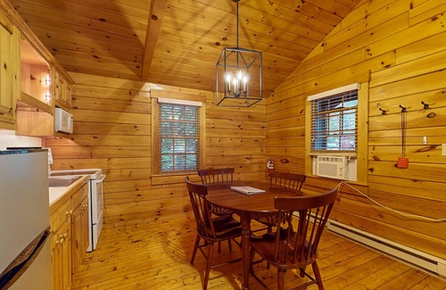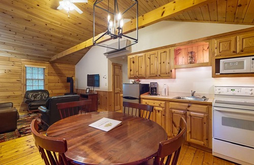 Inside, the cabin features a fully equipped kitchen with a 3/4 size refrigerator, stove, microwave, and coffee pot, making it easy to whip up meals for your group. The air conditioning ensures your comfort during warm summer days, while streaming capabilities let you enjoy your favorite shows and movies after a day of adventure. Plus, it’s dog-friendly, so your furry companions can join in the fun!