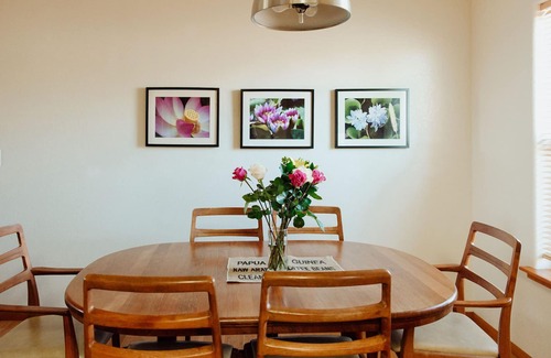Danish teak furnishings, bamboo flooring, and recessed lighting give the house a simple yet modern feel. The space is decorated with water lily prints, artifacts picked up on our travels, and local art.