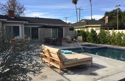 Beautifully renovated home with large outdoor entertainment space including a large heated salt water pool, hot tub, heat lamp, dining and lounging seating with mountain views. Inside is bright and open with a fabulous kitchen with a large island open to living and dining rooms. There is a primary en suite with a King bed sliding glass doors opening to hot tub and pool. There is an office/bedroom with queen pull out. A third bedroom with a full bed with an attached en suite with walk in shower. Living and dining area open to outdoor living space. A fully equipped kitchen. Counter seating for four open to dining area which seats 8. Cable TV and high speed internet. 60 inch TV. Ideal for a family vacation. We are centrally located to all Los Angeles attractions. Within an easy drive to Disneyland, beaches and 6 Flags Magic Mountain.