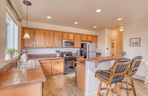 You can rest assured that you’ll find the relaxing coastal stay of your dreams at Rest Ashore. This traditional two-story home in a quiet neighborhood in off-the-beaten track Netarts gives you expansive woodland and distant ocean views, beautiful open living space, and furnished gathering spaces outside with oversized hot tub. You’ll find plenty of comfy seating and around the gas fireplace and TV in the windowed living room. The fully equipped kitchen is separated from the light-filled dining room by a breakfast bar. Double outdoor decks let you enjoy the ocean air and handsome views, with tables and chairs for dining. Upstairs, three pretty bedrooms, including a king suite with a soaking tub, assure a rejuvenating night’s sleep after your coastal adventures.