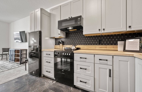 The kitchen, while compact, is thoughtfully equipped with all-new appliances, including an electric stove, butcher block countertops, a stylish tile backsplash, a refrigerator, and a pantry to store your essentials. Everything you need to prepare memorable meals in a charming space is right at your fingertips.