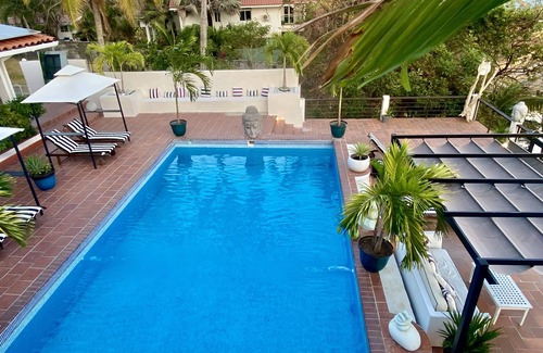 We as well have a honeymoon suite nestled in the side of a natural rock face providing complete unobstructed views of the beautiful Pacific Ocean. Hear the soothing sounds of ocean waves at night or take in the beauty in the daytime of the ocean, yachts and nearby island. The suite and the villa are not connected and separated by the outdoor pool & tanning terrace. Should you need or require additional sleeping space for more friends or family, there is the additional space of the suite.