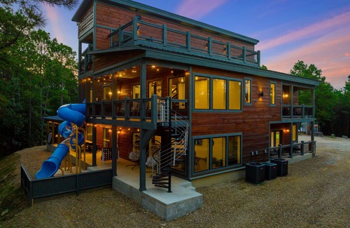 Brand New Luxury Cabin with Pool! Chutes N Stars, Rooftop Patio & Hottub, plus 3-Story Indoor Stainless Slide - fun Broken Bow Cabin Retreat! Perfect for your Family Reunion. Sleeps 32 guests in luxury beds. Boasting 5 King suites with en-suite Baths, 2 bunk rooms, cinema room and 9 bathrooms. Huge Gameroom with Pool Table, indoor disc climber, 8 foot Bubble Wall, Themed Rooms, Outdoor Games, and so much more! Exclusive Resort Clubhouse Access included with Stocked Fishing Lakes. Max 2 dogs.