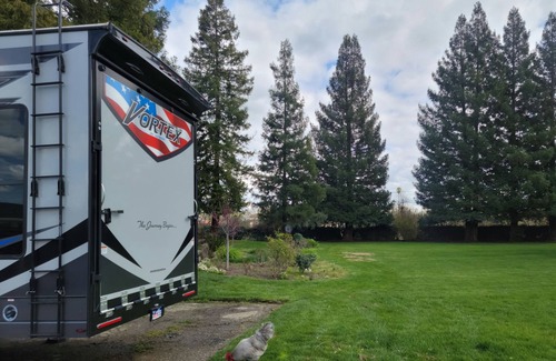 This memorable place is anything but ordinary. Rest comfortably tucked away in a 33ft Genisis Votex on a gated park-like property. Over 15 Coastal Redwoods line the lush oversized lawn and blooming garden beds just outside your door. The property runs a working farm and offers animal encounters for guests. Keep an eye out for the chickens. Schedule one on one encounters with bunnies, dwarf goats, chickens, and alpaca (hosts choice) in addition to your glamping stay. Easy freeway access to Kings Canyon National Park Entrance off 180 freeway.