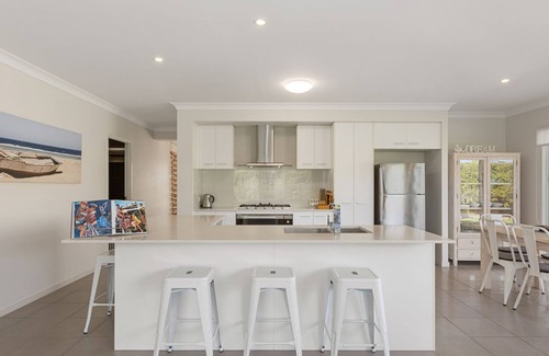 Your four legged friends are welcome and the house is set up to suit. Pets are welcome inside the house but not permitted on furniture. The garage has a baby gate for your pets to feel included in the family area, it also has an external door to the large fully fenced yard which overlooks the park to bring more of the-great-outdoors-feel in. A maximum of 2 pets allowed. The living area combines a beautifully appointed modern kitchen that is open and easy to entertain at the lovely north-east facing outdoor area. The kids will enjoy the space with the park behind to kick a footy or bring their bikes, scooters or skateboards to explore over 3 kilometres of cycleways within the beachfront village.