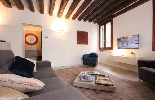 Elegant apartment with canal view located on the first floor in the Historic Center of Venice near Campo San Polo, one of the most beautiful squares in Venice, just 500 meters from the Rialto Bridge. The apartment consists of an open space with a double bed and a living room with a sofa bed, a walk-in closet, a complete kitchen with a dining table and a bathroom with shower. Design furnishings, air conditioning, washing machine, dishwasher. Extra bed on request (sofa bed). Rates include bed linen and towels. Tourist tax not included to be paid upon arrival. Self-check in is provided, all information will be provided after booking (ID: IT027042B46NGJLOMP).