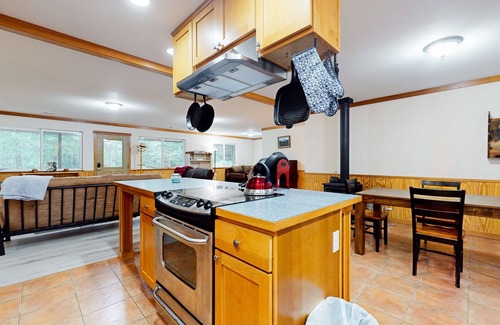 At home, enjoy the outdoors while gathered around the wood-burning firepit or watch the rain fall while relaxing under the comfort of the covered porch. The interior's open-concept layout is perfectly designed for family gatherings and a central wood stove provides a toasty warmth throughout the space. A full suite of stainless steel kitchen appliances, along with plenty of cookware and counter space, ensures family-style meal planning is a breeze. You can stream all your favorite shows and movies on the smart TV, or choose from one of the movie titles to watch on the Blu-ray player. A vintage player piano adds a touch of antique charm. There's also a small collection of books and a dedicated desk for remote working or school study.