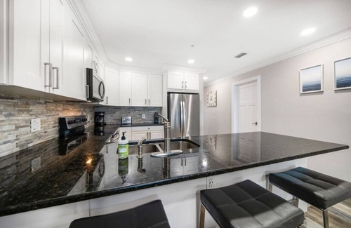 This beautifully renovated, 1,492 sq. ft beachfront condo comfortably sleeps 8 guests. Relax and enjoy the refreshing seaside. Our 3-bedroom unit consists of two king bedrooms and one queen bedroom. Each king bedroom is set up suite style with a sofa. The primary bedroom is ensuite with a double vanity, shower, and walk-in closet, featuring access to the balcony. Wake up to the sounds of the salty waves and views of the white sands. The additional king suite-style bedroom has direct access to the second bathroom, which features a double vanity and tub/shower. Both king bedrooms have an ottoman that can pull out to use as a single bed. The third bedroom has a queen bed. All bedrooms have smart TVs.