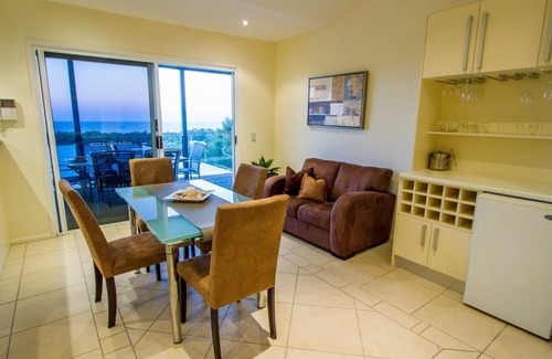 - Open plan kitchen, dining and lounge with ocean views and sofa bed.