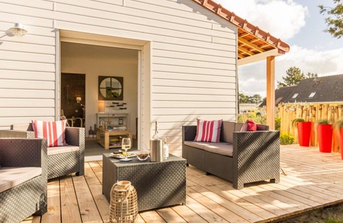 Detached house entirely on the ground floor. Living room with wood stove (wood provided) and kitchen area (dishwasher, freezer compartment, microwave). Shower room (walk-in shower). Toilet. Storage room. Bedroom (160X200 bed). Baby equipment on request (cot, high chair, bathtub, etc.). TV. WIFI. Washing machine. Dryer. Sheets and household linen provided. Beds made on arrival. Cleaning service included. Electric heating included. All charges included. Private enclosed grounds. Wooden terraces. Garden furniture. Deckchairs. Fire pit. Shelter. Private parking. Stays from Friday to Friday. Perched on its small sand dune in the heart of the seaside resort, this little house has a crazy charm! The steps to climb through cordylines and agapanthus, take you away from your daily life and bring you to this little paradise for two. Up there, you'll discover a cozy interior designed with great taste and inspiration by Sandrine and Joan. The light-filled kitchen is pleasant, and the comfortable sofa is just waiting to welcome you! The bedroom, paneled with old planks, gives the feel of a treehouse and will make you feel a little more at home. The break is complete, and the vacation can begin! The terrace, shaded by the umbrella pine, is a peaceful haven for a well-deserved nap, and morning coffee under the awning will be an opportunity to reflect on your leisure activities. A walk on the Cape? A boat trip to Jersey from Carteret Port? A round of golf? An invigorating swim in the sea? You'll be spoiled for choice...