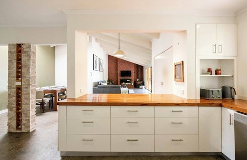 Indoors, the light-filled dining space offers a comfortable place to gather, or you can perch at the charming kitchen bar—because no country home is complete without one. The generous kitchen is fitted with beautiful wooden benchtops, an oven and a cooktop large enough to cater for the whole group with ease.