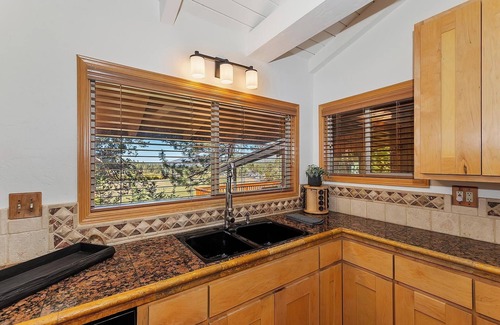 ✓ Sleek and Functional Kitchen: Equipped with newer appliances, including a gas range cooktop, wall oven, microwave, dishwasher, and fridge/freezer. A standard coffee maker is provided. Additional seating at the kitchen island allows for casual dining.