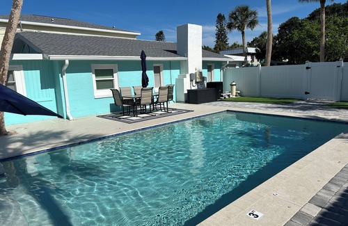 Updated 3 bedroom cottage ideally located. 1 block from Siesta Key village with many restaurants, nightclubs/bars with live entertainment. 3 blocks to beach! NO STEPS to climb! Large backyard with private heated salt pool with sundeck, patio, lanai, gazebo, fire pit, gas BBQ grill, 2 bicycles. outdoor shower, pet friendly, bags, mini golf, beach wagon, beach chairs, fenced yard, covered carport, internet, 3 high def TVs, washer and dryer Close enough for all the excitement of the village, yet far enough so you can have quiet relaxation