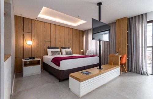 Cozy studio with everything you need for a top stay! Fluffy double bed, TV to watch your favorite series, air conditioning to chase away the heat and space dedicated to your notebook, in case you need to check that out at work. The kitchen is equipped with a fridge, cooktop, coffee maker, microwave and electric oven - ideal for preparing your favorite meals!