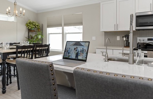 Our kitchen is equipped with just about everything your group may need to prepare meals at home or enjoy your favorite local takeout. Guests are welcome to use our dining table or kitchen island to sit together for a bite to eat.