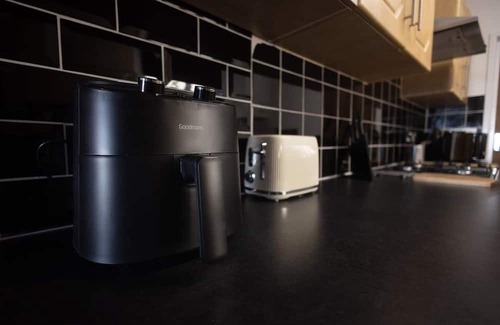 - Modern appliances including an oven, microwave, fridge/freezer, and kettle.