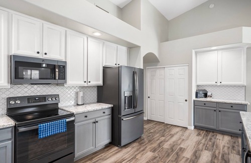 Step into a fully updated kitchen that’s as stylish as it is functional, featuring sleek stainless-steel appliances, custom-painted cabinetry, and an expansive center island that doubles as a breakfast bar—perfect for morning coffee or keeping the chef company. There's plenty of counter space for group meal prep, and the separate dining area seats eight beneath a warm farmhouse-style chandelier, ideal for shared meals and late-night laughs.