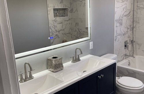 Each bedroom features a plush queen-sized bed, providing restful sleep for up to 6 guests. The home includes three full bathrooms—each with a shower, bathtub, and essentials like a hair dryer and double sinks for your convenience.