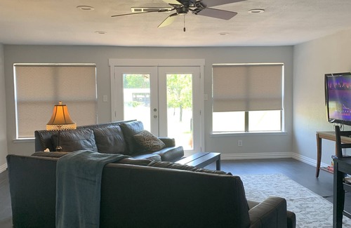 Relax with the whole family at this peaceful lakeside retreat when you book this home in Granbury. This 2 bedroom, 1.5 bath cottage sits a 2 minute walk from Lake Granbury for fishing/swimming. Enjoy a fully stocked kitchen with a large entertainment area while deer pass by the large backyard windows. Pack up the fishing poles, some friends or family and some swim suits and head this way for a nice getaway. BYO Boat!