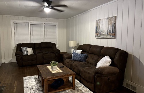 Located in the heart of Yadkvin Valley Wineries. Newly remodeled, Spacious 5 bedrooms, Comfy couch, Large Dining Room table, serene view. This home is minutes away from Slightly Askew Winery, and downtown. Ideal for large groups and family gatherings. Hardwood floors throughout, and futon bed kid friendly and a designated office area. Professionally cleaned and throughly sanitized between each visit for your safety and comfort standards. We look forward to having you as a guest. Safe Travels!