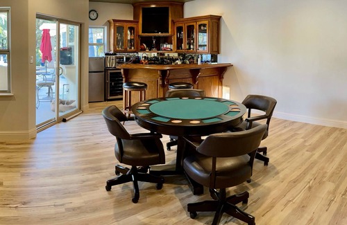 Large Four Bedroom home with King beds. Fully stocked for the indoor and outdoor kitchens. Some unique features here - Gorgeous Dining room table, Game Room and an Outdoor shower. We have two fire pits with comfortable patio furniture surrounding them. Our backyard is designed to stay a while with a basketball court, golf hole to chip, pool, and a huge grass area lit up with lights at night.