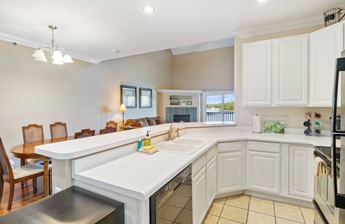 The condo is conveniently served by an elevator, making access effortless. The interior features all the comforts of home, including a gas fireplace, central air conditioning, a washer/dryer, and internet access. The fully equipped kitchen boasts modern appliances, making meal preparation a breeze. Enjoy your meals at the breakfast bar or in the more formal dining area with a large table and chairs.