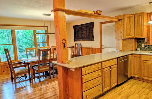 The main part of the house features a living room with a cozy fireplace and a TV. With a fully equipped kitchen and dining area that seats 8. There is also a second living room around the corner with additional seating that leads out to the spacious screened-in deck. Here, you can enjoy views while relaxing outdoors, listening to the birds, or simply enjoying some quiet time.