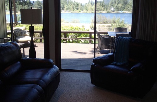 The living room, dining area and deck all face the Mill Pond and Penman Peak. There simply is no better spot to watch the fireworks over the pond!! The deck has comfortable outdoor furniture and a dining table that seats four so you can enjoy al fresco dining on the pond. A gas barbeque sits around the corner of the deck out of view.