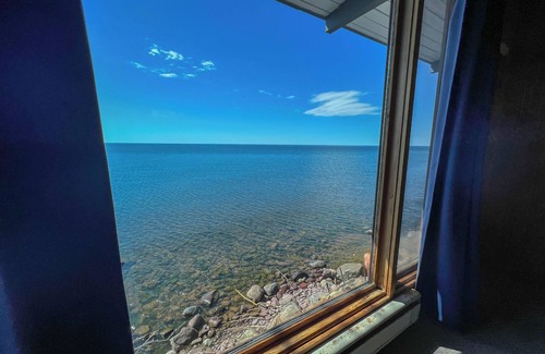 Spring House has a unique layout where the main living area is on the second level of the home- providing guests with amazing 180-degree views of Lake Superior from the main living area. The floor-to-ceiling and wall-to-wall windows in the living and dining room areas make it feel like you're perched just above the Lake's edge. Two bedrooms and a bathroom are also on the upper level.
