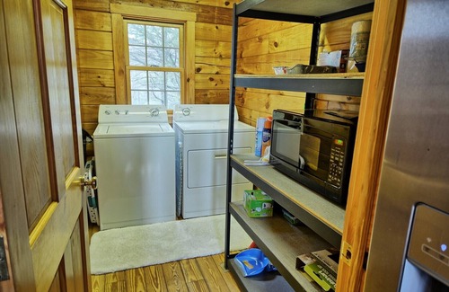 Main Floor: On the main floor, you have the cozy living room with a wood burning fireplace (seasonal), Roku TV, dining area and our fully stocked kitchen with a regular coffee maker, microwave, Jenn-Air gas stove with 4 burners, air fryer, and more! Please note, there is not a dishwasher.