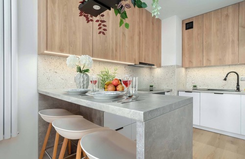 The bright and spacious living room is the perfect place to spend time together: a Smart TV with internet television hangs on a stylish brick wall, guaranteeing entertainment after an eventful day, and opposite it is a comfortable sofa bed with double sleeping space. The living room opens onto a sunny, furnished balcony, which is the perfect space to relax with a book or morning coffee. Guests have at their disposal an induction hob, oven, microwave and essential amenities such as a dishwasher and fridge-freezer. Meals can be enjoyed comfortably at the bar counter with chairs, while planning your next attractions in Łódź.