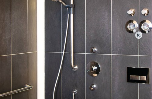 The apartment is suitable for wheelchair users. There are no annoying thresholds or partitions. A spacious bathroom with hose shower and overhead shower, as well as grab bars and bidet.