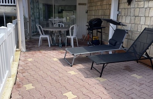 Covered terrace with garden furniture, deckchairs, and barbecue.