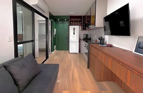Top Modern apartment for business and leisure at the best area in São Paulo Pinheiros - Faria Lima. 24 hours Entrance with permanent security. Perfect for 1 ou 2 adults with a small Baby. You are a few steps from Metro Station Faria Lima, Shopping Eldorado Mall, Carrefour supermarket, and the best Restaurants and Bars, all just around the corner. Privileged location City Center, Paulista Avenue, MASP Museum. Fantastic condominium, swimming pool at the rooftop, Sauna, Fitness Center, Coworking area, and Laundry. High standard Kitchen, Microwave, Induction Oven, Nespresso Coffee Machine, Toaster, Mixer, Filtered Water and Grill. We offer Wi-fi, air condition and a hammock for a relax moment while enjoying a glass of wine and the amazing view from the balcony. Family friendly Studio with a new Baby Crib and high chair (up to 3 years old). Easy access by public transport, Bus, Metro, Train and Uber. Taxi just in front of the property. New apartment, inspired and designed with a lot of care by Swiss Brazilian owner.