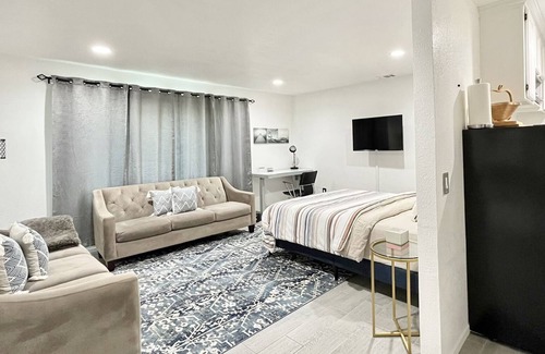 Come stay at this charming and relaxing studio apartment with private entrance, its own garage and ready for self check-in! This home is located in a quiet and peaceful cul-de-sac street. This studio has many amenities including exercise equipment and in-unit washer and dryer. It is centrally located near universities, shopping malls, hospitals, airports and more.