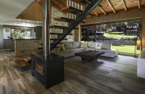 This amazing 4-bedroom design house is set in a unique spot surrounded by native forest, lakes and mountains, just a few blocks away from Lago Gutierrez and next to Arelauquen Golf and Country Club. Just a 15-minute drive away from Cerro Catedral and a 25-minute drive from downtown Bariloche, it is the perfect place to enjoy a ski vacation close to the resort or to stay surrounded by nature during the warmer seasons.