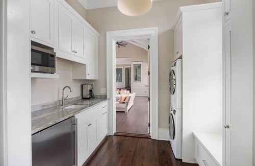 The second level includes a luxe den/media room, with oversized flat screen TV, comfortable seating area and built-in desk area for remote work or catching up on email. Additionally you'll find the exquisitely designed primary suite with KING bed, doors that lead to an expansive and ultra-private second story screened porch and spacious ensuite bathroom that includes a soaking tub and step-in marble shower. Wake up to views of the expansive second story screened porch from the second floor guest suite with KING BED and ensuite full bathroom. The show stopping second-level porch is where everyone in the family will want to gather for afternoon cocktails, take in the river breezes or spend evenings around the fire, This oversized porch includes an abundance of comfortable seating and offers a convenient way to access the guest cottage from the main house. The second level also provides a laundry area with stack washer/dryer.