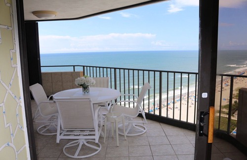 Located on the 17th floor of the prestigious Maisons Sur Mer ocean front high rise on Shore Drive in Myrtle Beach. We have a very strict 4 person maximum for staying in this condo. There are 2 bedrooms (a master suite on one side and a guest suite on the other side). Our unit had a professional make-over - it is beautifully designed, bright, and very upscale. Hardwood floors throughout the unit. Tiled bathrooms. Large tiled balconies. We get full afternoon sunshine and we have amazing ocean views from every room.