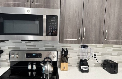 The kitchen area with numerous cooking appliances and spacious countertops is right when you walk in. If you want to take a break from the restaurants, then this is the place for you.
