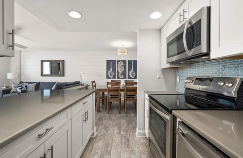 The condo has three bedrooms and two full bathrooms. The Master Bedroom is 14' x 12' with a king sized bed and a master bath with tub. The second bedroom is 13' x 11' with a queen bed. The third bedroom (which is 12' x 13') has two bunk beds for a total of four twin beds. The second upgraded bathroom serves the second and third bedrooms as well as guests. The L-shaped living room/dining room area has a 15' x 15' living room space with a large sectional sofa, 55 inch flat screen TV with cable, including an HDMI connection for anything electronic you bring along. The dining room (10' x 8') has ample table that seats six comfortably. The kitchen is updated with appliances, quartz counters, and an open layout to maximize the whitewater views. Porcelain tile flooring is installed in all bedrooms and the main living area.