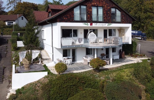 The apartment in Haus Rosenzeit has 5 rooms. Each of the rooms is equipped with a bathroom. There is a TV in each of the rooms. A new, high-quality kitchen offers the possibility of self-catering. In the kitchen is a cozy dining area for a small snack in between. Being together for dinner, playing games, watching TV, etc. is also taken care of. It was for the guests a living-dining room (Rose period 1) lovingly furnished and equipped (for example, a chest with many board games is ready to use). A large balcony (31 sqm) with a breathtaking view invites you to linger. In front of the house is a spacious barbecue area with high quality teak furniture. Again, you can "relax" and enjoy the beautiful nature. A parking lot in front of the house offers enough space for ten vehicles. The nearest supermarket is 7 km away (Stetten a.k.M).