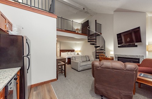 This luxury Studio with Loft Standard View Suite accommodates up to six and offers the comforts of home at an affordable price. This suite is perfect for a romantic getaway offering a cozy gas fireplace, or for families needing extra space. Enjoy a King size bed, a Queen sleeper sofa, a gas fireplace, flat-screen TV, and a DVD player with the convenience of the kitchenette with a full-size refrigerator, toaster, microwave, dishwasher, and dinnerware with a dining table on the main level. The bathroom has a shower/tub combo with towels and essential bath amenities provided. Head out onto your private balcony with chairs to get some fresh air. In the loft, you will find a Queen bed, sofa, closet, and flat-screen TV overlooking the main level. Â Experience the convenience of the elevator or stairs down to our beautiful lobby areas leading out to the lakefront deck and lawn.Â