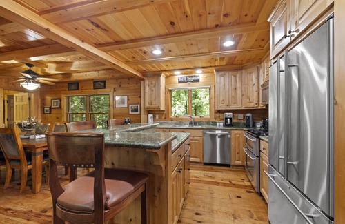 This custom 2,200 sq ft log cabin is a true artisan-crafted retreat, built entirely from Eastern White Pine and filled with thoughtful details. The home features 3 private bedrooms, a spacious open loft, and 2 full bathrooms. Soaring beam-and-purlin ceilings and tongue-and-groove pine walls create a cozy yet open atmosphere.