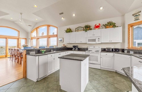 OCEANFRONT Avon - Ocean Isle Estates - Endless ocean views and luxurious resort amenities combine to make NEPTUNE'S NEST a seaworthy sandcastle your family will return to year after year. Start your sea odyssey with a dip in the sparkling private pool or an indulgent soak in the nearby hot tub, with refreshments served from the covered cabana wet bar with a convenient mini-refrigerator and bar stools. Step inside and let the games begin in the ground floor game room with a smart TV, pool table, pub table that reverses to a poker top, and wet bar with full size refrigerator and microwave. Around the corner you'll find two master bedrooms, each with two sets of bunks and a smart TV. For an idyllic lazy afternoon, drift upstairs for a nap in one of five well-appointed king master suites, each with a smart TV. You'll also find a convenient powder room on the second level landing. On the top level, Neptune himself would be proud to hold court in the sprawling great room with large flat screen smart TV and floor to ceiling windows capturing postcard perfect ocean views. The kitchen will please the most discriminating chef with marble countertops, spacious center island and raised counter top with bar chairs. Everyone will love dining with the picturesque ocean vistas in the background, and the living area welcomes weary family members with bright cheerful decor including a handy wine bar, comfy furnishings, and TV. The king of this castle will enjoy the elegant top level king master suite with smart TV, and large bath with Jacuzzi tub and double vanity. Everyone will enjoy the views from the sunset-soaked tower room. With lush resort amenities and front row ocean vistas, your family will consider NEPTUNE'S NEST their castle by the sea.