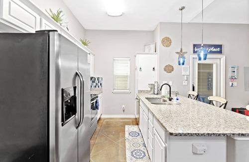 Offers a well-equipped kitchen with granite countertops and stainless steel appliances. Dining table can seat 6 and the island bar can seat 3.