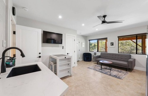 Downstairs, find a complete separate suite with its own full kitchen, sofa seating, and a convenient workspace. Retreat to the private bedroom with a king bed and ample closet space, and freshen up in the full bathroom with an available washer and dryer.